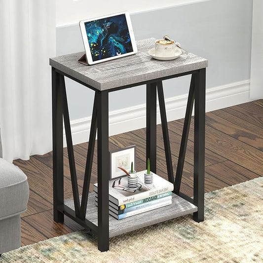 "Modern Edge V-Frame Narrow Side Table with Dark Wood Finish – Compact End Table with Geometric Metal Design and 2-Tier Open Storage – Perfect for Living Room, Bedroom, or Entryway Décor – Sleek,