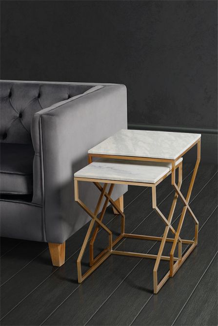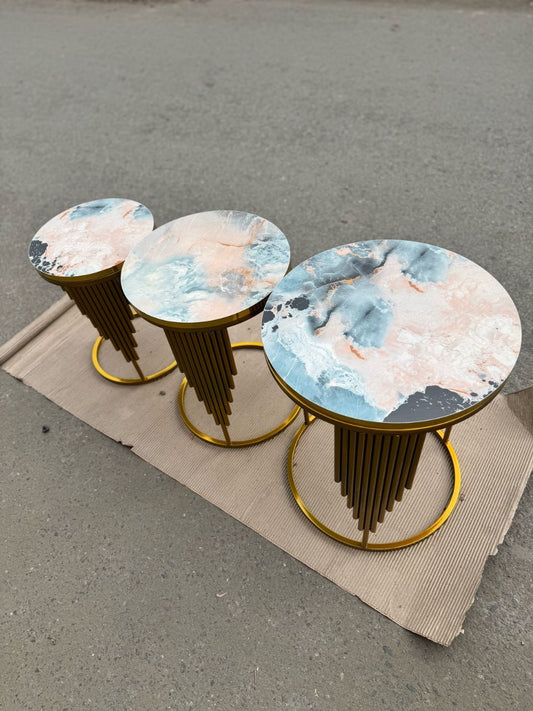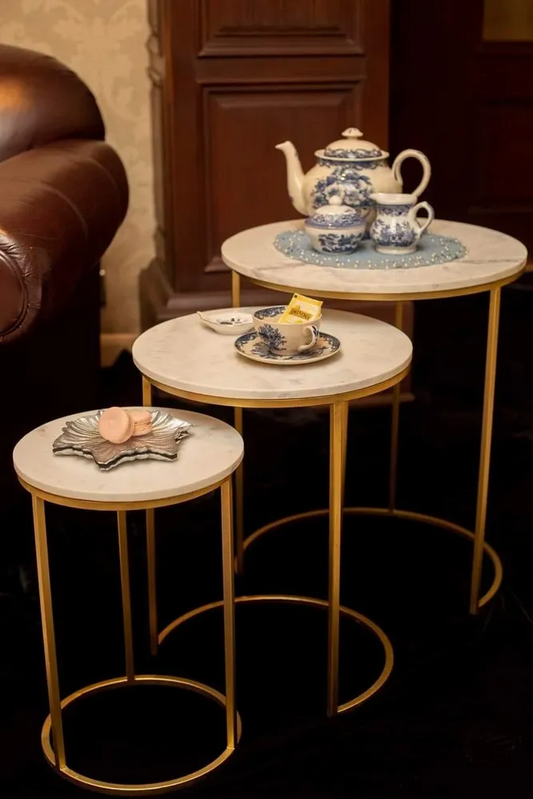 Contemporary Nesting Tables - Golden Metal Frame with Marble Texture Tops | Metal Furniture