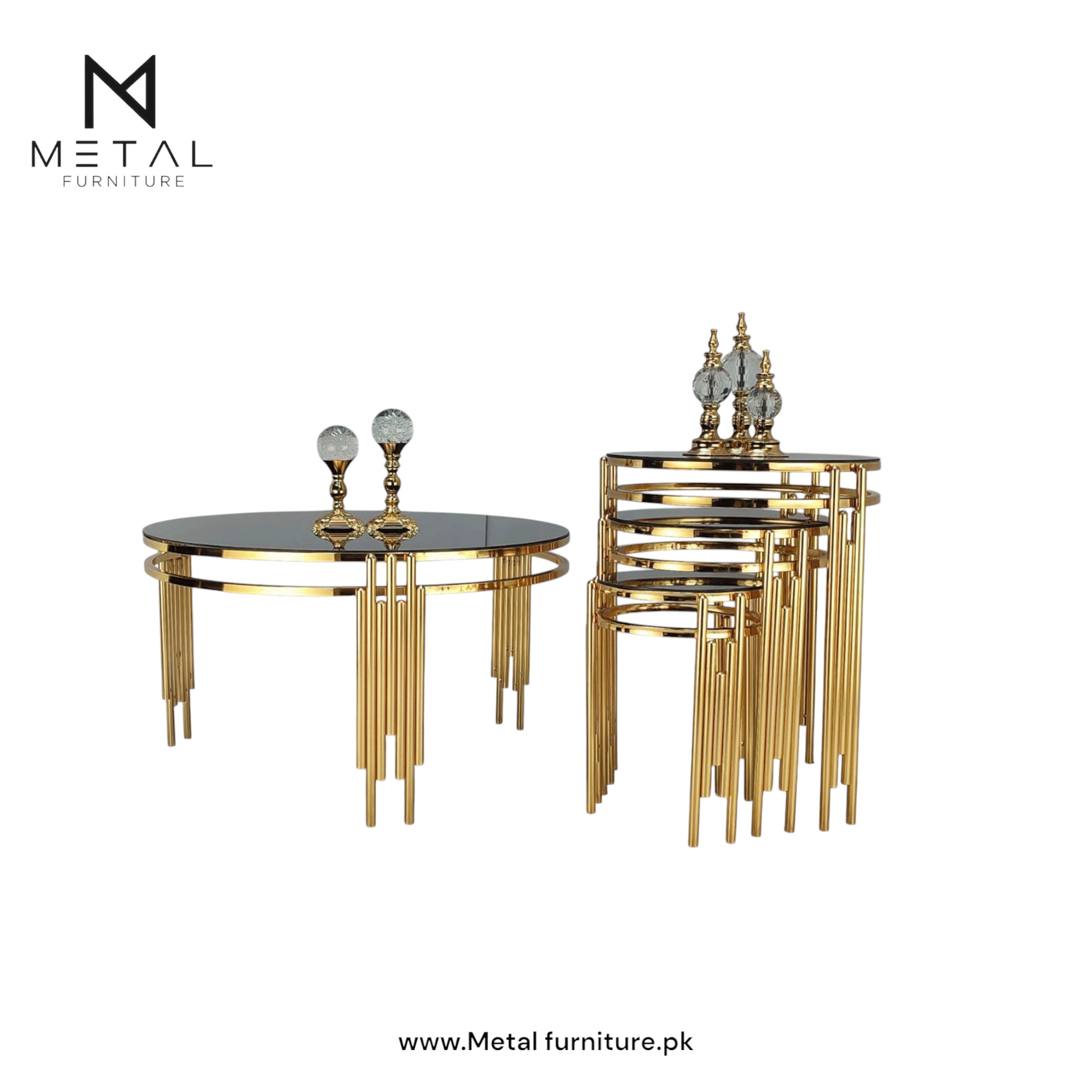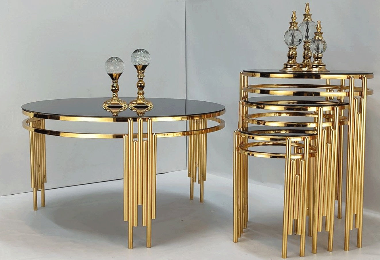 Introduce elegance and glamour to your living space with the Round Table Set, featuring a modern round design that radiates luxury. This stunning set includes one round center table and three round nesting side tables, all crafted with a sleek gold metallic frame and a high-gloss black glass top for a refined finish.